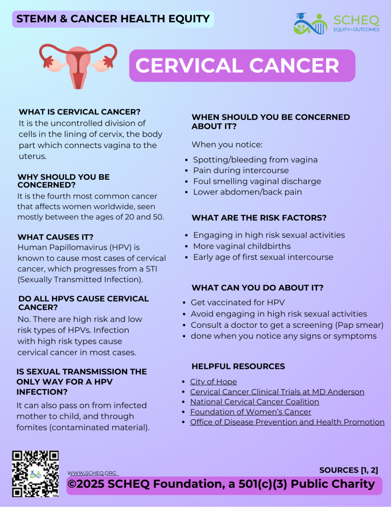 This infographic from the SCHEQ Foundation explains cervical cancer, its causes, symptoms, risk factors, and prevention strategies. It highlights the role of HPV in cervical cancer, signs to watch for like abnormal bleeding or pain, and steps individuals can take such as vaccination and screenings. The resource also lists helpful organizations for further support and […]