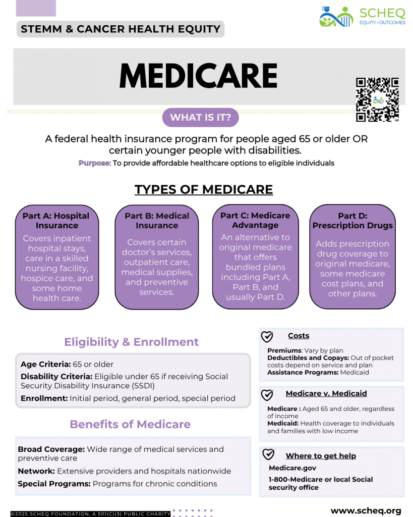 This SCHEQ infographic offers a clear, supportive overview of Medicare, the federal health insurance program for individuals aged 65+ and those with certain disabilities. It breaks down Medicare Parts A through D, covering eligibility, benefits, and costs. Designed to promote health equity, the resource also includes helpful guidance and tools for navigating coverage options.